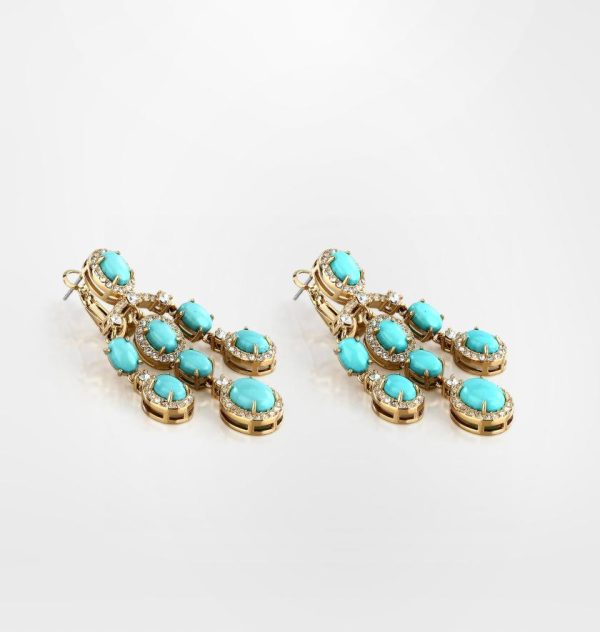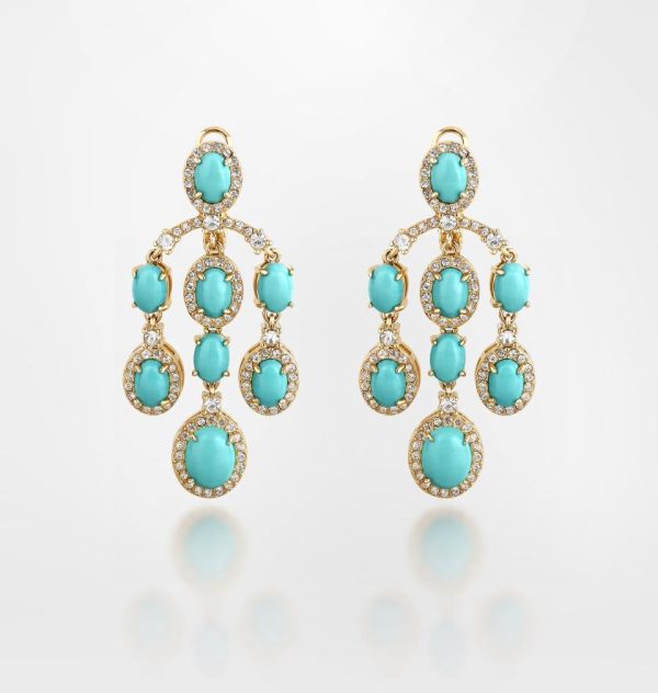 Pair of chandelier earrings with oval turquoise paste cabochon accentuated by a brilliant cubic zirconia pave. Comfortable and secure clip-on closure,